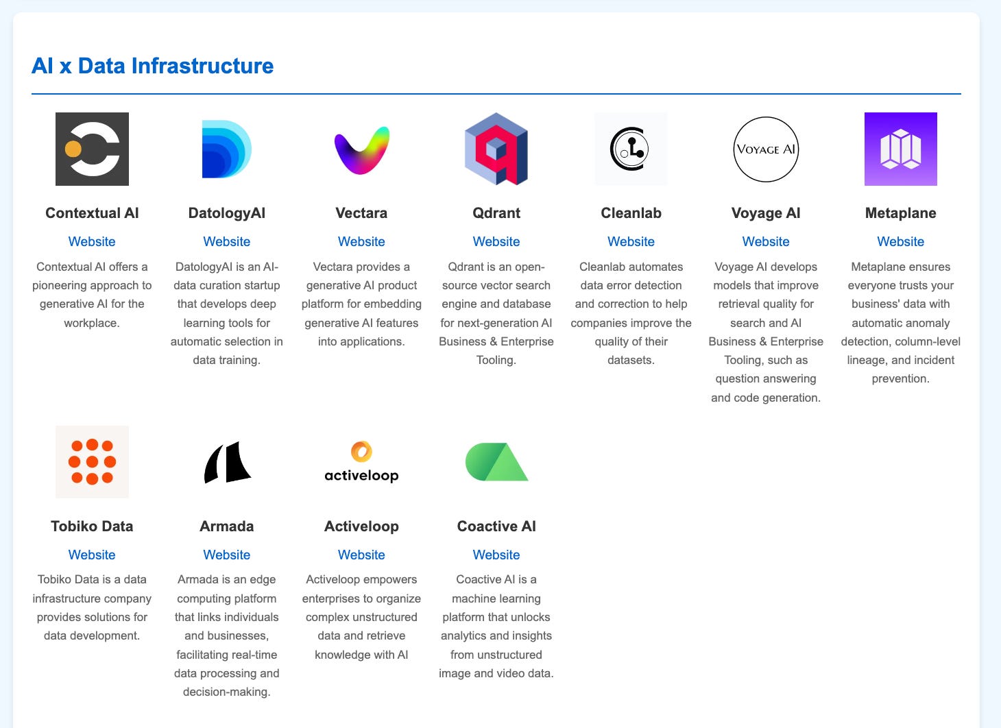 Data processing, management and RAG (Contextual AI, Voyage, Tobiko Data, Vectara, ActiveLoop)